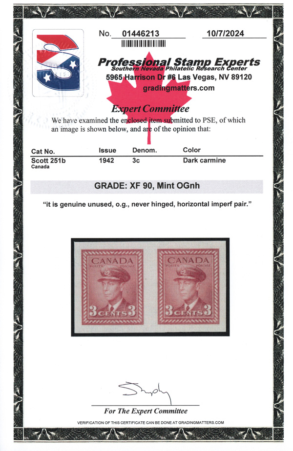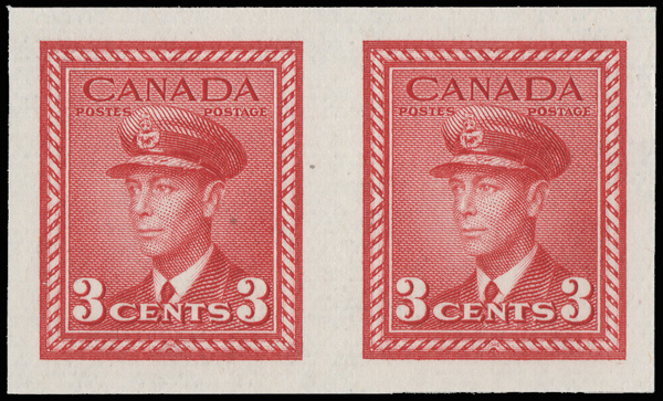 5749 nh 251b image1942, King George VI, 3¢ dark carmine, imperf (Scott 251b), a gorgeous horizontal pair, o.g., never hinged, fresh and bright with generous, beautifully balanced margins, Extremely Fine. Only 150 pairs were available., with a 2024 P.S.E. certificate graded XF 90.