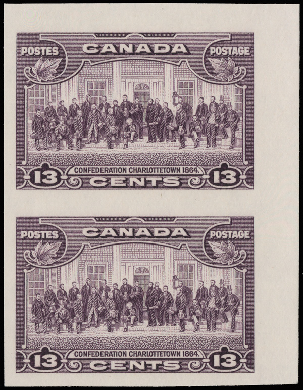 5747 nh 224a image1935, 13¢ Charlottetown Conference, imperf (Scott 224a), a lovely upper right corner sheet margin vertical pair, o.g., never hinged, exceptionally fresh with large margins, Very Fine to Extremely Fine. No more than 150 pairs are possible., with a 2018 P.S.E. certificate graded VF-XF 85.