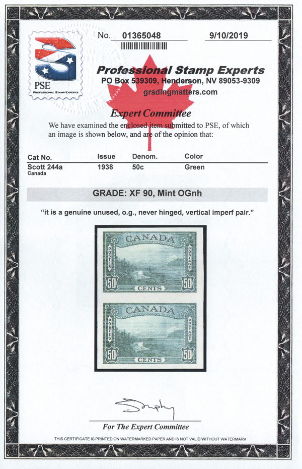 5748 nh 244a image1938, 50¢ Vancouver Harbor, imperf (Scott 244a), an exceptional vertical pair, o.g., never hinged, bright and fresh with generous margins, Extremely Fine. No more than 75 pairs are possible., with a 2019 P.S.E. certificate graded XF 90.