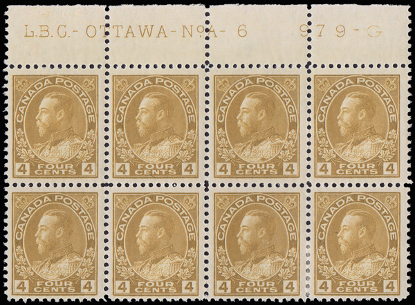 5728 ogbl 110d image1925, King George V "Admiral", 4¢ yellow ocher, dry printing (Scott 110d), top Plate No.A 6 block of 8, o.g. (five stamps never hinged), fresh and reasonably centered, Fine to Very Fine.