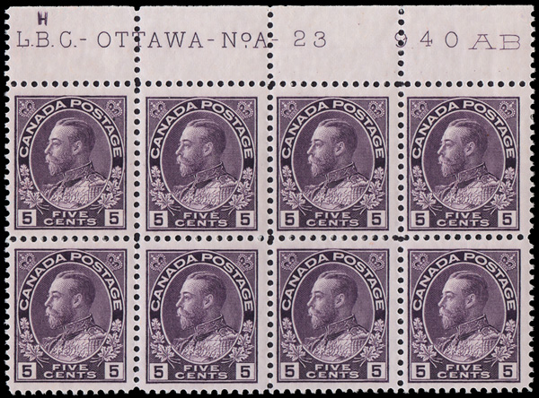 5731 nhbl 112c image1925, King George V "Admiral", 5¢ violet, dry printing (Scott 112c), top Plate No.-A 23 block of 8, o.g. (seven stamps never hinged), bright, fresh and quite well centered, Very Fine.