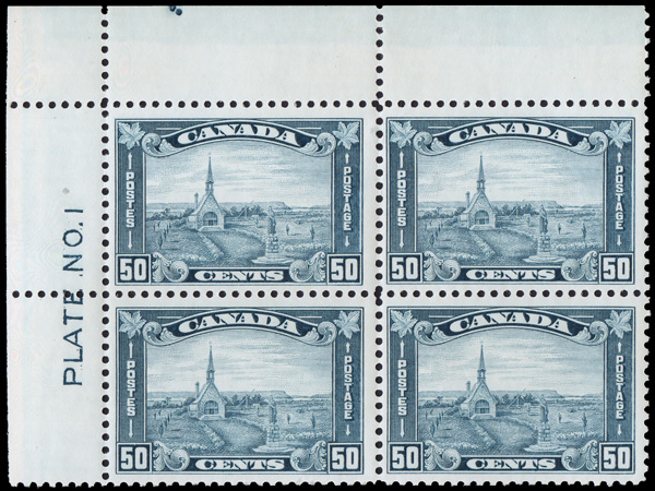 5744 nh/ogbl 176 image1930, 50¢ Grand Pré (Scott 176), upper left Plate No. 1 block of 4, o.g. (3 stamps never hinged), Fine to Very Fine.