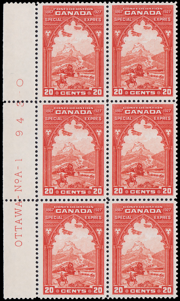 5758 nhbl E3 imageSpecial Delivery, 1927, Confederation, 20¢ orange (Scott E3), a choice left Plate No.A-1 block of 6, o.g., never hinged, fresh and well centered, Very Fine.