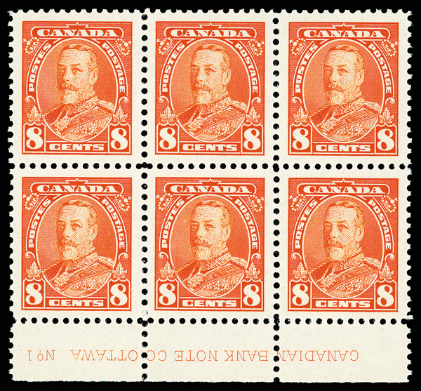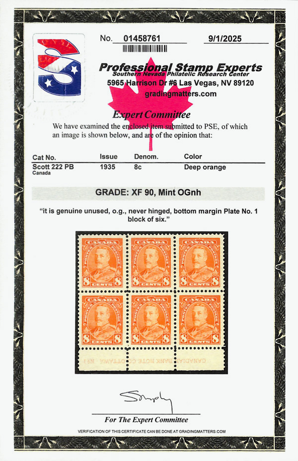 5746 nhbl 222 image1935, King George V, 8¢ deep orange (Scott 222), bottom margin plate No. 1 block of 6 with imprint, o.g., never hinged, sound and Post Office fresh with deep color on like-new paper, Extremely Fine, unpriced in SMQ, with 2025 P.S.E. certificate graded XF 90.