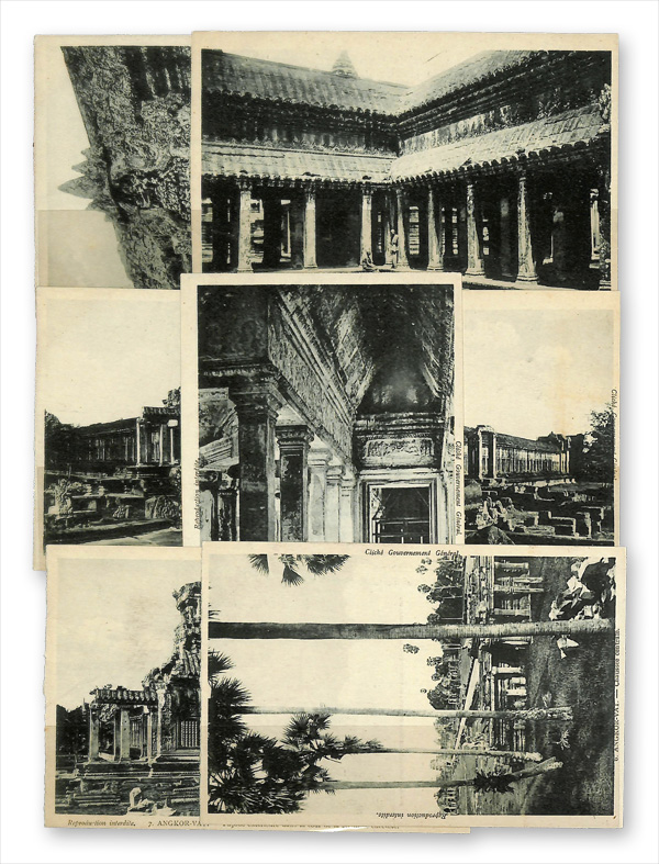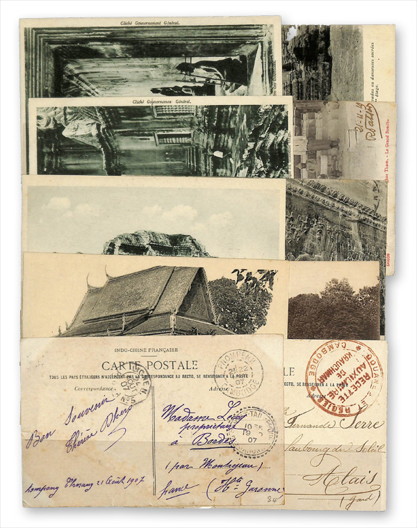5784   imageCambodia, Picture Post Card Collection, 1907, Angkor-Vat temple card to France with 5c franking tied KOMPONG-CHANG CAMBODGE cancel of 21 AOUT 07, transit cancels of 19 and 22 plus LINGE N. PAQ.FR No.5 of 24 AOUT 07; undated and unfranked showing Dancers to France with red DOUANES ET REGIES CAMBODGE / RECETTE AUXILIAIRE DE KRAUCHMAR marking; also group of 15 unused all different mainly of Angkor-Vat; 17 items in total, Fine to Very Fine. (Image) (Image2) (All Images)