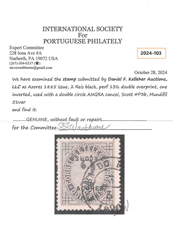 5770 O P3b imageNewspaper Stamp, 1885, 2r black, double overprint, one inverted (Mundifil #51 var) (Scott P3b), neat double circle Angra c.d.s.; single nibbed perforation at the left (not mentioned on certificate), otherwise Very Fine and rare. Unpriced by Scott, 2024 ISPP certificate. (Image) (Image2) (All Images)
