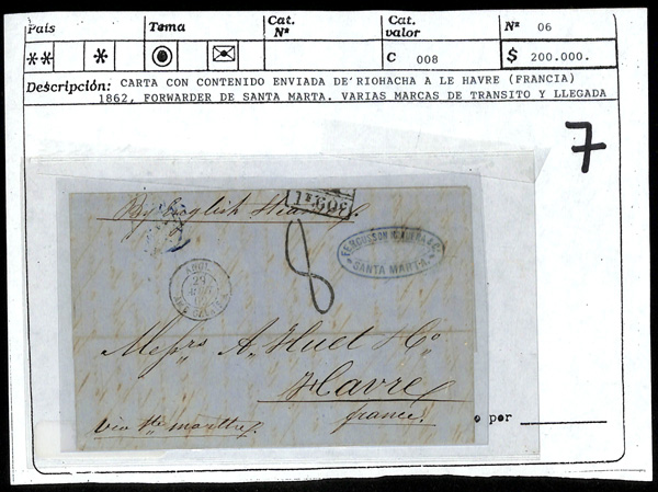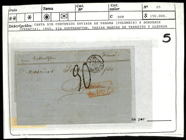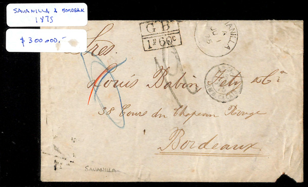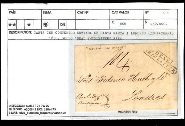 5789   image1830-75, Four Stampless Covers to England & France, 1830 folded letter from Santa Marta to Huth & Co. in London England with framed "Deal Ship Letter" handstamp at top right, 1855 folded letter sheet from Panama (was part of Colombia) to Bordeaux France via Southampton England, with backstamps from all 3 countries, 1862 folded letter from Riohacha to Le Havre France with "Fergusson Noguera & Co. Santa Marta" forwarder's blue double oval and French handstamps on both sides and a London backstamp, and an 1875 cover from Savanilla to Bordeaux France, British and French postmarks on both sides, cover refolded at top prior to use, but with piece out at bottom right, Very Fine lot. (Image) (Image2) (Image3) (Image4) (All Images)