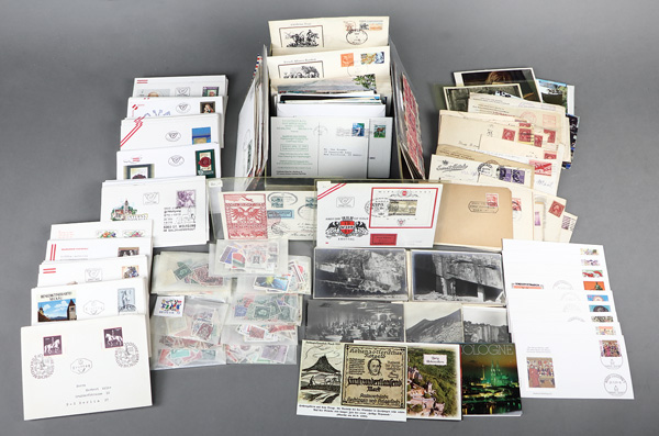 5768   imageAustria, Comley Ersttag FDC collection 1949-1997, 200 different Austrian First Day and event envelopes with marvelous pictorial cancels including sets and Semi-Postals; 100 US Bicentennial event commemoration covers; a few inch thick stack of postcards fairly evenly divided between classic and modern, postally used and mint; a few hundred loose WW adhesives in envelopes; several better envelopes including three sent internally in Manila when the Japanese occupied the Philippines, a Registered envelope from the US (covered in stamps) to Venezuela in 1931, five FDCs from Israel (some with tabs), oversized GB souvenir envelope with stamp series honoring Jane Austin; and four Russia covers from 1891-1914; clean lot, Fine to Very Fine. Shipping charges apply - weight 6.1 lbs. (Image) Suggested Bid $200