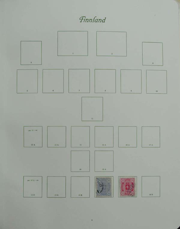 5799   imageFinland, Well-Filled Collection, 1860-1996, well filled, mint never hinged, mint hinged and used stamp collection in two Schaubek albums; some better material such as (Michel no's): 488 (mint never hinged), Fieldpost stamps 8 (mint never hinged), 9 (mint never hinged), etc.; also Aland 1984-96 present, fully imaged online; unavailable for in-person viewing. (PDF for this Lot) (Image) Suggested Bid $400