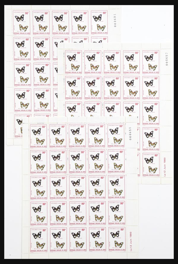 5790   imageCongo (Republic), Butterflies Issue, 1980, small box with the butterfly set of Congo 1980, mint never hinged in complete sheets with some found loose; Michel cat. #751-755 (no #752, 15Fr); cat. value over €81,000, fully imaged online; unavailable for in-person viewing. (PDF for this Lot) (Image) Suggested Bid $325
