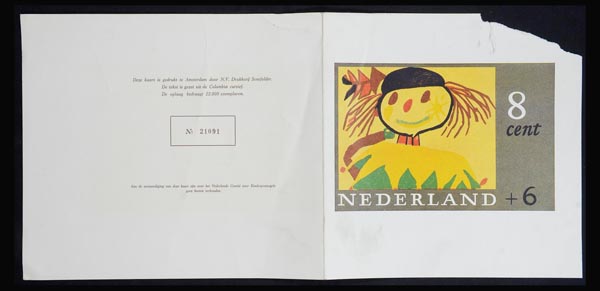 5902   imageNetherlands, Child Charity Compliment Card, 1965, folder with three varieties of the Children's Charity compliment card; includes one simply punched but not cut clean, one diagonal punched and one non-punched; unique material, never seen before, fully imaged online; unavailable for in-person viewing. (PDF for this Lot) (Image) Suggested Bid $300