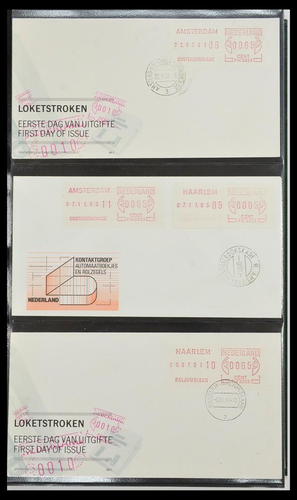 5906   imageNetherlands, ATM Stamps on First Day Covers Collection, 1981-86, collection of 141 FDCs in FDC album; very rare, fully imaged online; unavailable for in-person viewing. (PDF for this Lot) (Image) Suggested Bid $120