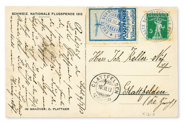 5954   imageSwitzerland, Group of Airmail Labels on Cover, 1913-24, features three postcards with airmail covers, two from 1913 and one from 1924; all in good condition; attractive examples that are a wonderful acquisition for any collector; please see full photos online. (PDF for this Lot) (Image) Suggested Bid $200