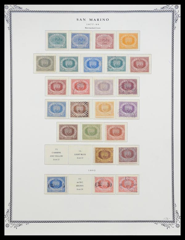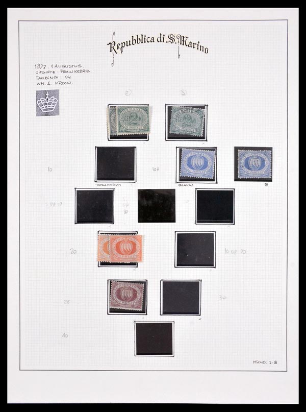 5923   imageSan Marino, Near-Complete Collection, 1877-1976, almost complete, mostly mint never hinged and mint hinged collection on Scott album pages in springback; the collection includes (Michel no's): 2 (mint), 4, 5, 15 (mint), 21 (mint), 22 (mint), 34-45 (mint, 44 missing), 68-80 (mint), 99 (mint), 100-104 (mint), 138 -140 (mint), 141-144 (mint), 175-179 (mint), 184-191 (mint), 215-226 (mint, 224 missing), 290-291 (mint), 464-475 (mint), Postage Dues 10-17 (mint), etc., fully imaged online; unavailable for in-person viewing. (PDF for this Lot) (Image) Suggested Bid $600