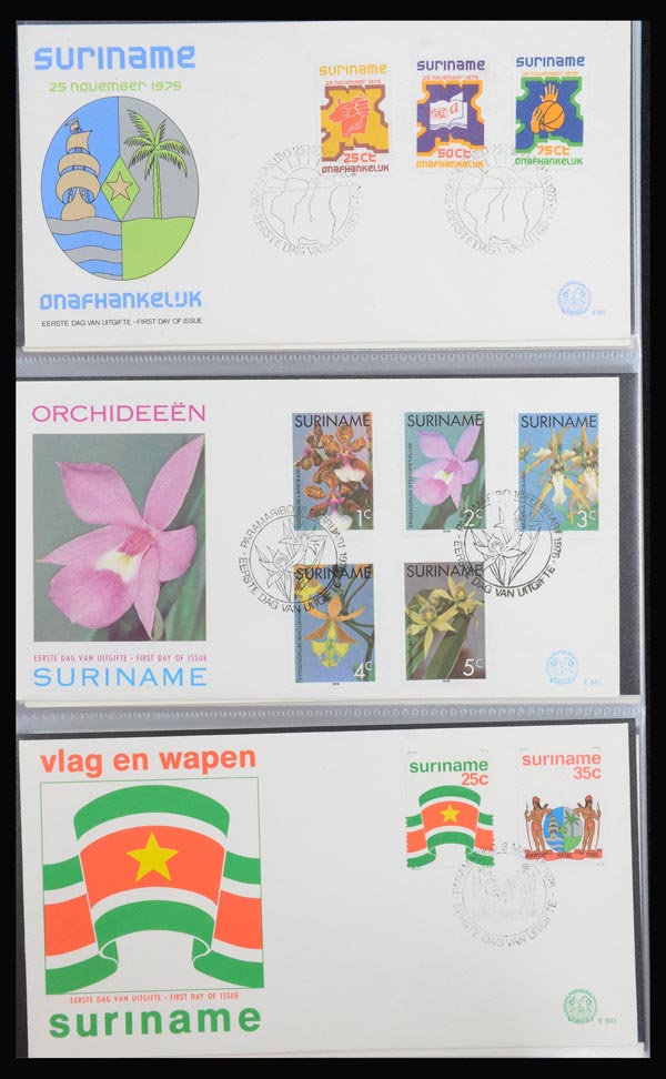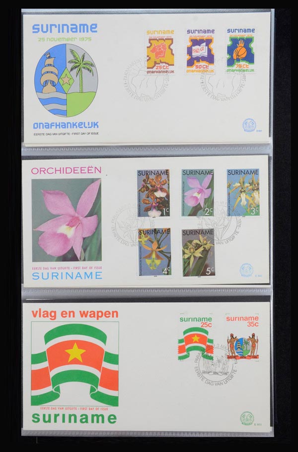 5929   imageSuriname, Collection of First Day Covers, 1975-2005, almost complete collection of unadressed first day covers in two Davo FDC albums; catalogue value approximately €3900, fully imaged online; unavailable for in-person viewing. (PDF for this Lot) (Image) Suggested Bid $200