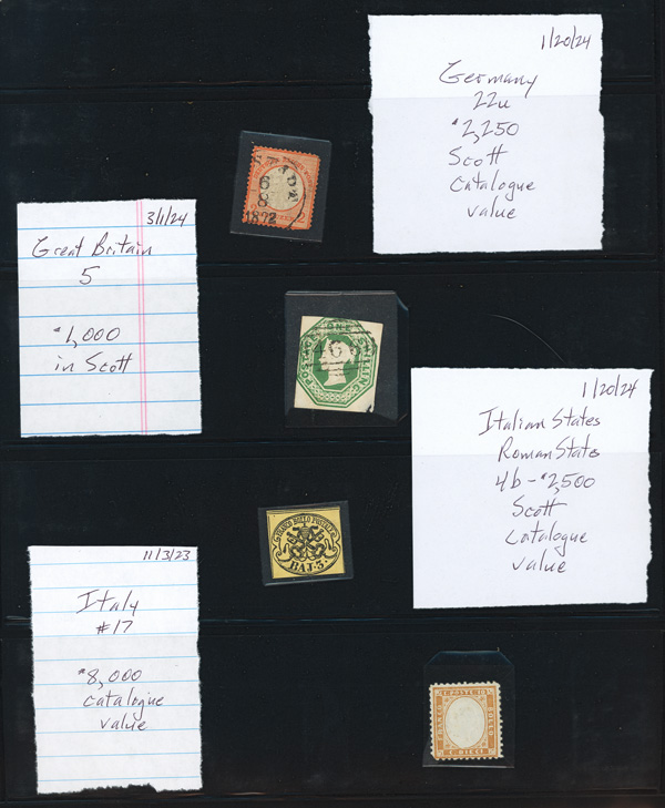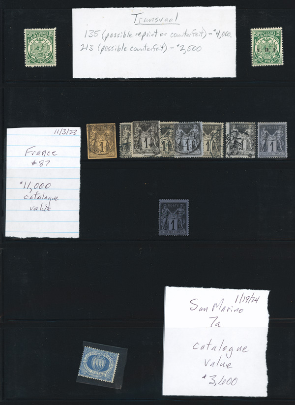 6033   imageWorldwide, Time for Certificates? 1850-1882, a small group of important stamps; includes Great Britain #5, Germany 22u, Roman State 4b, Italy 17, Transvaal 135, 213, France 87, and San Marino 7a; if good there is tremendous value here, Fine to Very Fine. (Image) (Image2) (All Images)