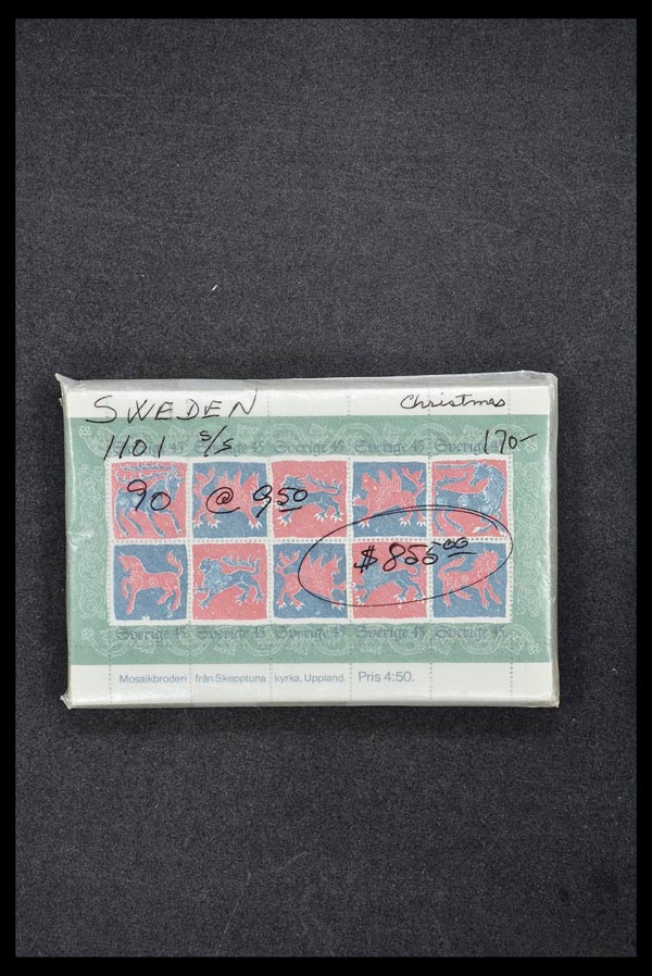 6017   imageScandinavia, Wide-Ranging Stock Array, 1855-1976, box with various material from Scandinavia, including a stockbook with many mint never hinged stamps from Sweden, stockpage with #1 (8) from Norway, some unused serpentines from Finland, Sweden 1974 embroidery sheet 90x (Michel sheet 6), Greenland sports stamp 1976 (MIchel 97) in 50 complete sheets (2500 stamps) etc., fully imaged online; unavailable for in-person viewing. (PDF for this Lot) (Image) Suggested Bid $400