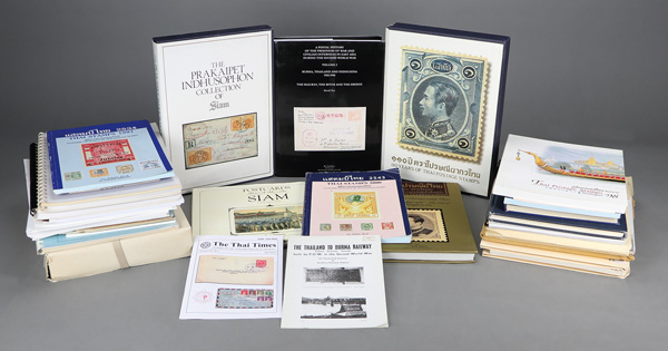 6059 L thailand imageMini Thailand Philatelic Library, 110 Years of Thai Postage Stamps (1993 Thailand), Waterlow Proof Sheets (1970 Collins), Postal Stationery of Siam (1938 Linnemann), Air Post of Thailand (1972 Fawdry), Postage Stamps of Siam (1904 Holland), Revenue Stamps of Thailand (1979 Holland), Thai Stamps (1991 Siriwong), Lithograph Surcharges of Siam (1993 Ryan), Post Offices and Postmarks after 1982 (1995 Cameron), Thai Philately (2000//2011), Postal Stationery Catalog (1999 Blakeney), Postage Stamps of Siam to 1940 (1979 Frajola), Thai Postage Stamps Catalogue (1998 Koshpasharin), POW in WWII Vol 3 (2005 Tett), Government Post Offices Vol 1 (1997 Blakeney), Royal Siamese Postal Service (1983 Davis), Prakaipet Indhusophon Collection of Siam (1989 Indhusophon), The Thai Times (1981 Swanson), and assorted other titles; a rich collection for the specialist, Fine to Very Fine. Shipping charges apply - weight 44 lbs. (Image) Suggested Bid $145