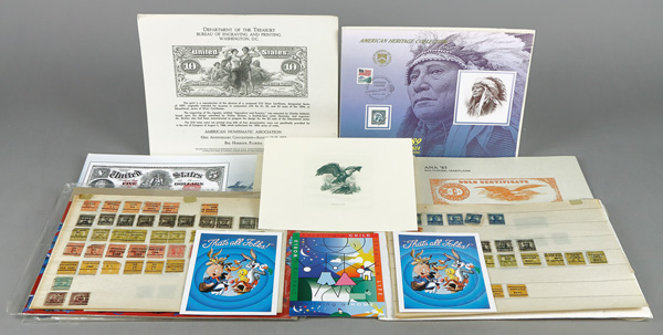 6041   imageWorldwide, Odds and Ends 1924-2022, 54 Bureau of Engraving and Printing (BEP) show cards (minimal duplication and all beautiful); partial sheets from Austria and Great Britain; a few hundred precancels mounted with hinges on pages; mint postal reply cards; souvenir sheets from Bhutan, Comores, The Gambia, Great Britain, and elsewhere; nice, Fine to Very Fine. Shipping charges apply - weight 3.2 lbs. (Image) Suggested Bid $200