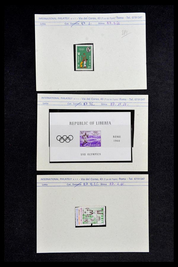6050 sports olympics imageWorldwide, Olympics Cover & Stamp Accumulation, 1932-76, nice lot of mint sets, souvenir sheets, and miscellaneous covers, covers range from 1932 including Los Angeles with 5¢ plate block, 1936 Australia multicolored postcard with special cancel, 1948 Great Britain set plus scarce Kuwait overprint set, 1952 Helsinki Finland, etc., a small cover album contains a set of 80 different 1960 Rome Olympic cacheted event covers showing athletes and their sports all cancelled during July and August, well worth attention, fine to very fine. Shipping charges apply - weight 6.4 lbs. (Image) Suggested Bid $105