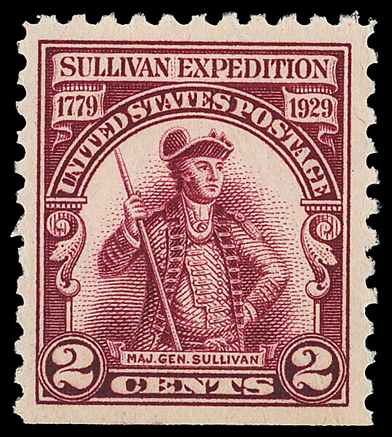 5109 nh 657a image1929, 2¢ Sullivan Expedition, lake color error (Scott 657a), bottom margin single, o.g., never hinged (gum skips), Very Fine to Extremely Fine, with 2001 P.S.E. certificate for strip.