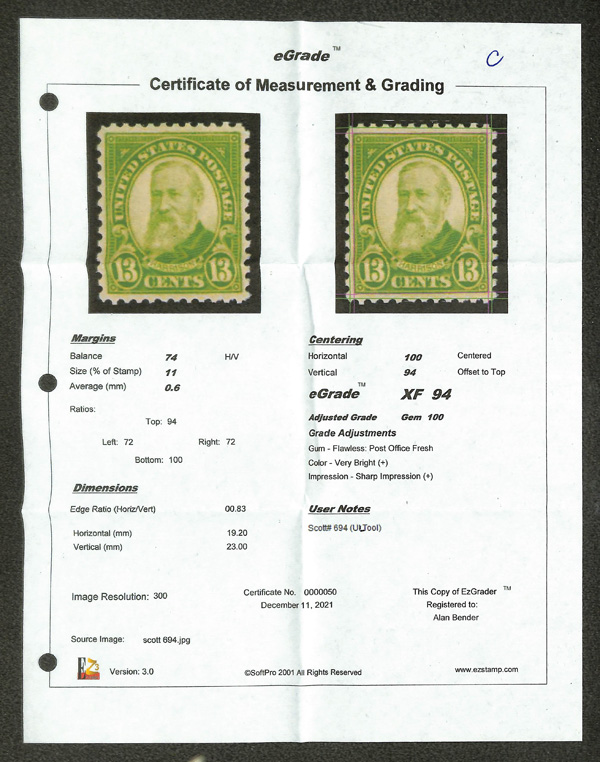 5095 nh 622 image1926, 13¢ Harrison (Scott 622), large borders with vibrancy, o.g., never hinged, Superb, with 2003 P.S.E. certificate graded SUP 98.