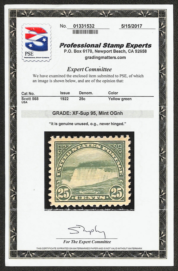 5081 nh 568 image1922, 25¢ Niagara Falls (Scott 568), remarkably fresh tone, o.g., never hinged, Extremely Fine to Superb, with 2017 P.S.E. certificate graded XF-SUP 95.