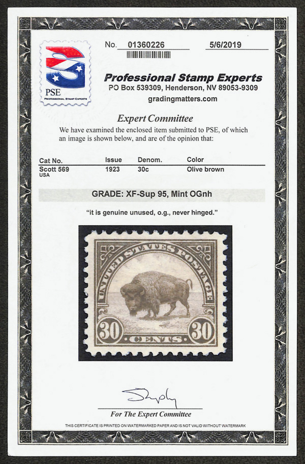 5082 nh 569 image1923, 30¢ American Buffalo (Scott 569), beautiful broad margins enhance design, o.g., never hinged, Extremely Fine to Superb, with 2019 P.S.E. certificate graded XF-SUP 95.