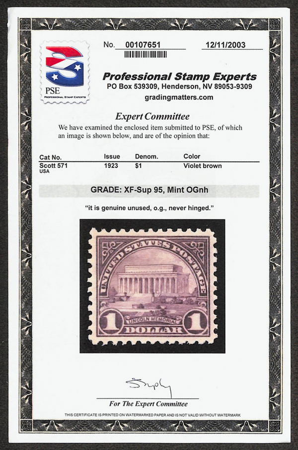 5084 nh 571 image1923, $1 Lincoln Memorial (Scott 571), pure brilliance of freshness, o.g., never hinged, Extremely Fine to Superb, with 2003 P.S.E. certificate graded XF-SUP 95.