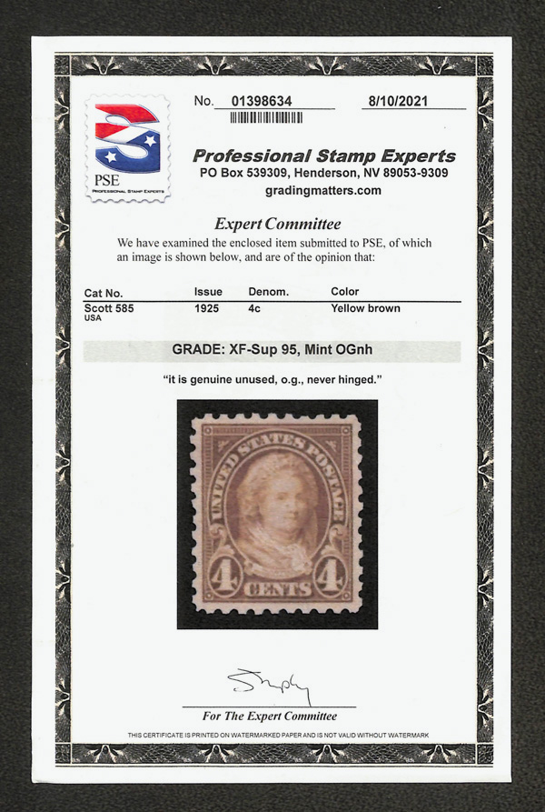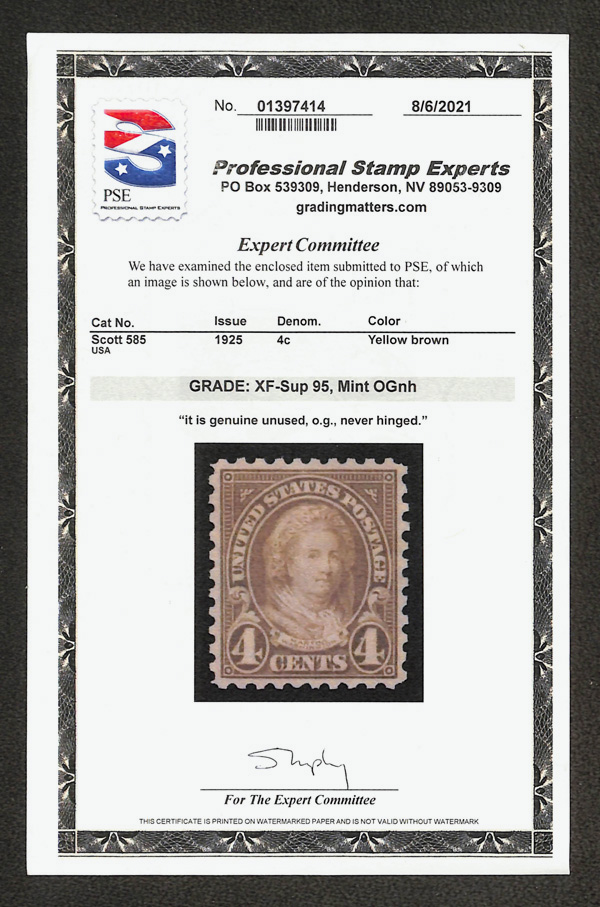 5089 nh 585 image1925, 4¢ Martha Washington, rotary press printing, perf. 10 (Scott 585), remarkably bright freshness, o.g., never hinged, Extremely Fine to Superb, with 2021 P.S.E. certificate graded XF-SUP 95.