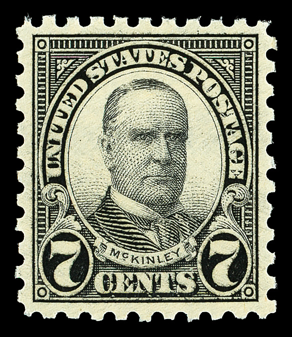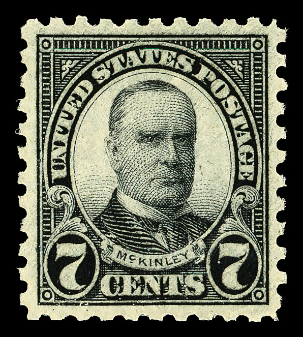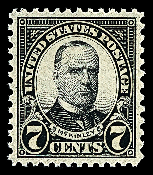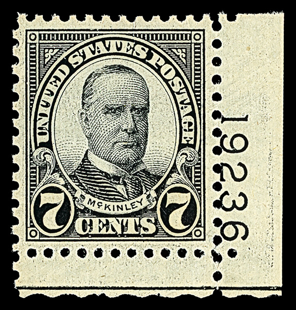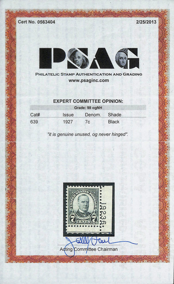 5103 nh 639 image1927, 7¢ McKinley, rotary press printing (Scott 639), single with plate number, striking in color and shape, o.g., never hinged, Superb, with 2013 P.S.A.G. certificate graded SUP 98.