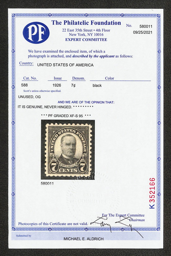 5090 nh 588 image1926, 7¢ McKinley, rotary press printing, perf. 10 (Scott 588), marvelous full-border margins, o.g., never hinged, Extremely Fine to Superb, with 2021 P.S.E. certificate graded XF-SUP 95.