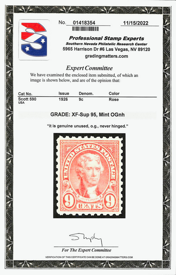 5092 nh 590 image1926, 9¢ Jefferson, rotary press printing, perf. 10 (Scott 590), bold, mint condition freshness, o.g., never hinged, Extremely Fine to Superb, with 2022 P.S.E. certificate graded XF-SUP 95.