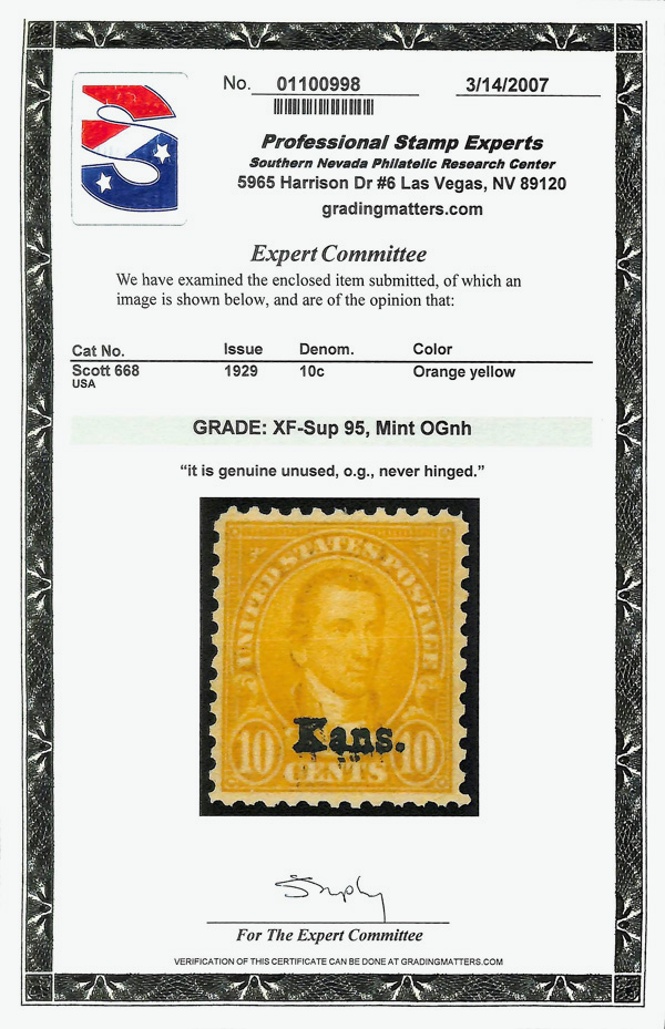 5111 nh 668 image1929, 10¢ Kans. (Scott 668), dynamic eye appeal, o.g., never hinged, Extremely Fine to Superb, with 2007 P.S.E. certificate graded XF-SUP 95.