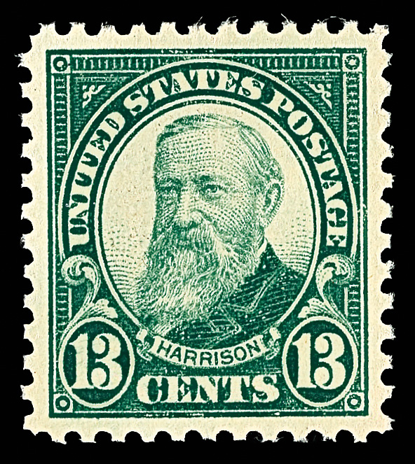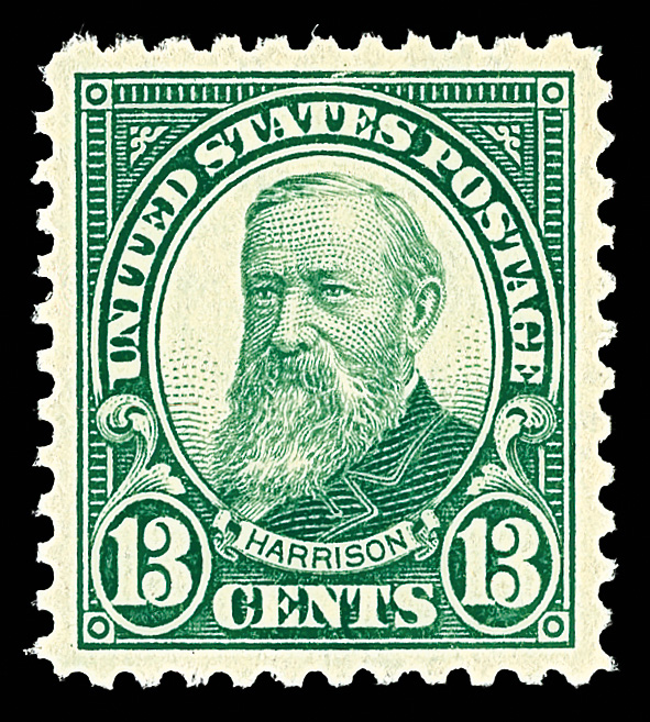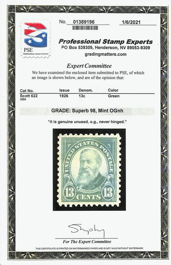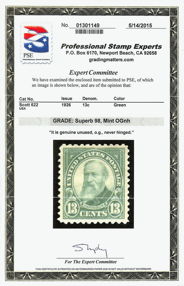 5093 nh 622 image1926, 13¢ Harrison (Scott 622), perfect tone and symmetry, o.g., never hinged, Superb, with 2021 P.S.E. certificate graded SUP 98.
