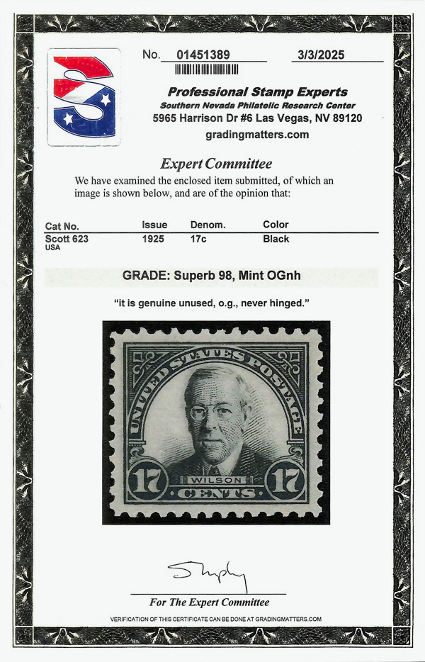 5096 nh 623 image1925, 17¢ Wilson (Scott 623), powerful ink and balance, o.g., never hinged, Superb, with 2008 P.S.E. certificate graded SUP 98.