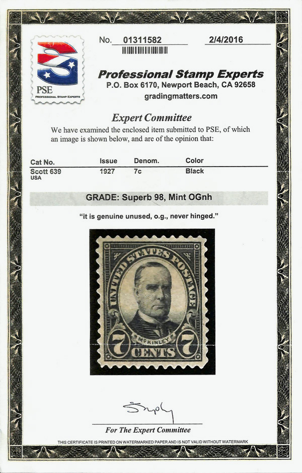5104 nh 639 image1927, 7¢ McKinley, rotary press printing (Scott 639), oversized and well-defined, o.g., never hinged, Superb, with 2016 P.S.E. certificate graded SUP 98.
