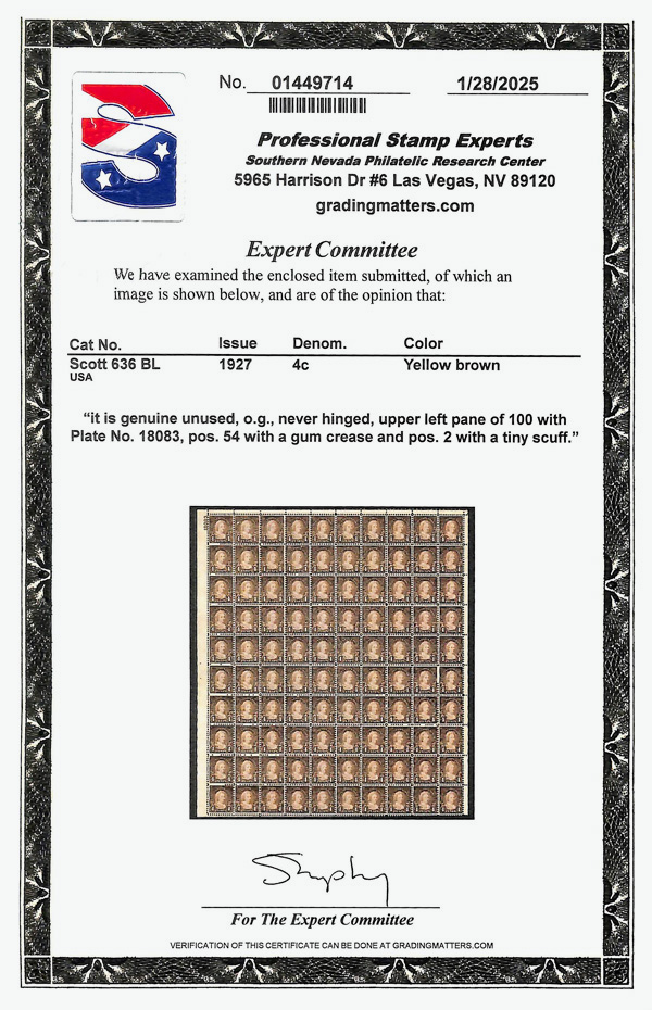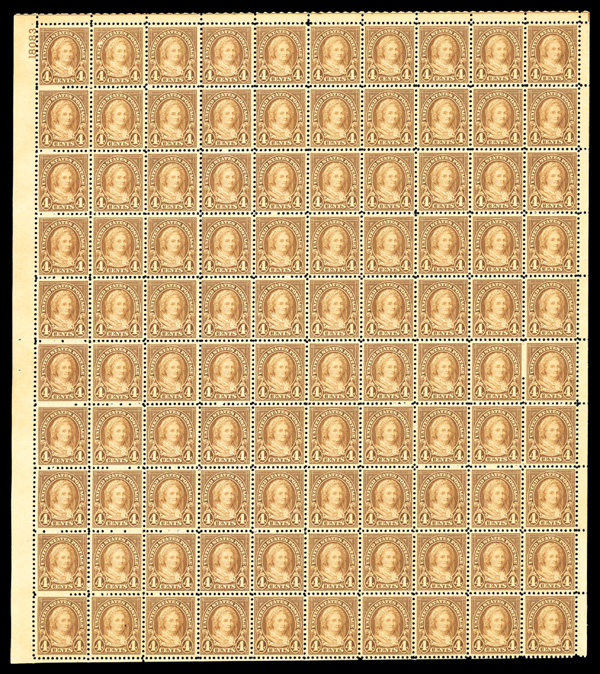 5099 nhbl 636 image1927, 4¢ Martha Washington, rotary press printing (Scott 636), top left full pane of 100 with plate number 18083, o.g., never hinged, attractive with solid color and clean lines; gum crease position 54, tiny scuff position 2, Fine to Fine-Very Fine, with 2025 P.S.E. certificate.
