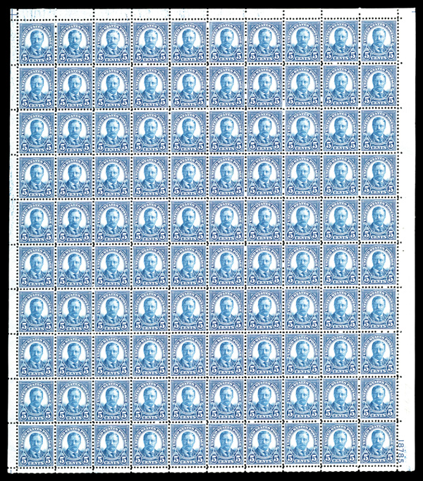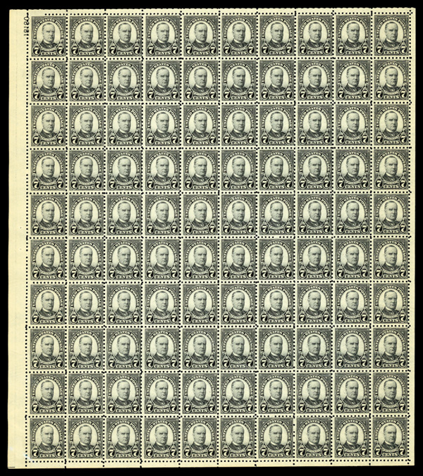 5105 nhbl 639 image1927, 7¢ McKinley, rotary press printing (Scott 639), top left full pane of 100 with plate number 18180, o.g., never hinged, sound and fresh with clear impression, Fine to Fine-Very Fine, consignor notes PSE certificate #1410110 (not present).