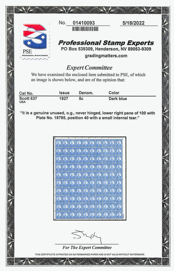 5100 nhbl 637 image1927, 5¢ Roosevelt, rotary press printing (Scott 637), bottom right full pane of 100 with plate number 18785, o.g., never hinged, clean in crisp color with appealing centering; position 40 with small internal tear, Fine to Very Fine, with 2022 P.S.E. certificate.