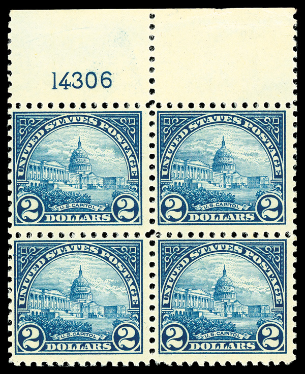 5085 nhbl 572 image1923, $2 U.S. Capitol (Scott 572), top margin block of 4 with plate number 14306, o.g., never hinged, a pretty block with crisp, solidly colored detail on glowing white paper; couple light natural gum creases, Fine to Very Fine.