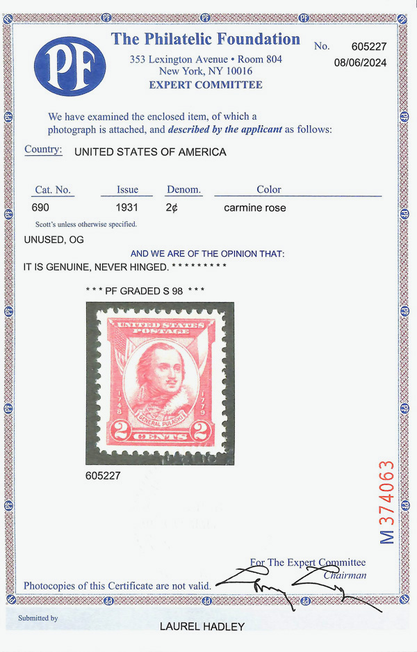 5113 nh 690 image1931, 2¢ Pulaski (Scott 690), Striking centering appeal, o.g., never hinged, Superb, with 2024 P.F. certificate graded SUP 98.