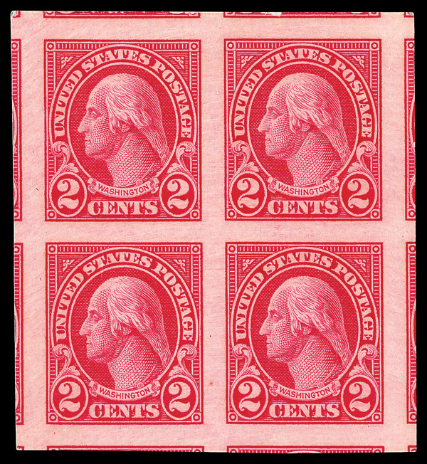 5087 nhbl 577 image1923, 2¢ Washington, imperf. (Scott 577), block of 4, o.g., never hinged, Superb, with 2019 P.S.E. certificate graded GEM 100J.