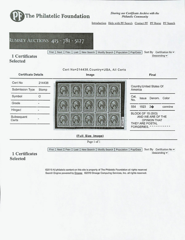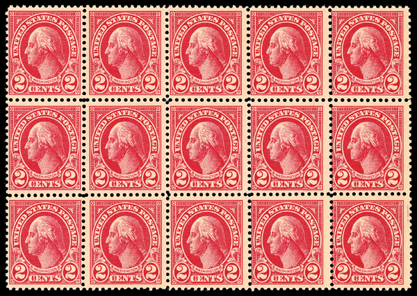 5098 Fbl 634(CF3) image1926, 2¢ Washington, type I, rotary press printing, postal forgery (Scott 634(CF3)), horizontal block of 15, o.g., never hinged, fresh with bright color clearly showing characteristics, perforations sound and solid, Fine to Very Fine, with print-out of P.F. certificate #214438.