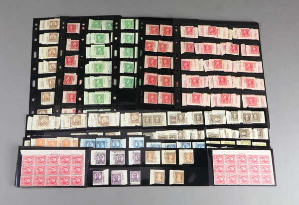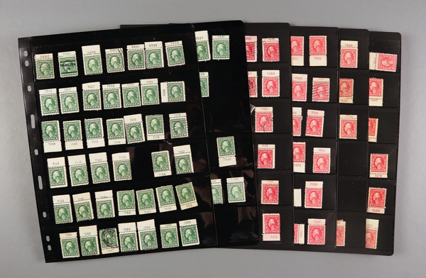 5151 424-425 image"Outnumbered" Exhaustive Plate Number Singles Holding, 1914 (Scott 424-425), The 1¢ & 2¢ Washington, perf. 10 with single-line watermark, and arranged on Vario stocksheets in numerical order by plate number. There are approximately 121 examples of #424 and 255 of #425, of which only about 20% are used. Visually defective or fully separated selvage generally not counted. A fun collection with further room for expansion, overall Fine to Very Fine, viewable in its entirety. Shipping charges apply - weight 0.6 lbs. (PDF for this Lot) (Image) Suggested Bid $240