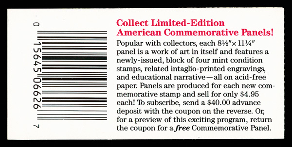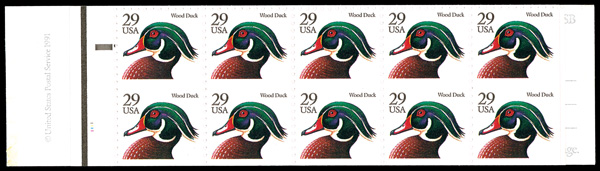 5140 BKnh 2484g image1991, 29¢ Wood Duck, black "29 USA", booklet pane of 10, imperf between (Scott 2484g), complete unexploded booklet with both panes the error, each pane with perforations at top and straight edge (tiny arcs of one or two perforation holes) at bottom; fresh, o.g., never hinged, Very Fine.