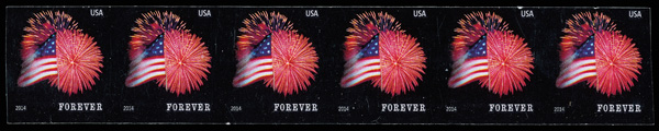 5149 nh 4868b image2014 (49¢) (forever) Fort McHenry Flag and Fireworks, pair, die cutting omitted (Scott 4868b), three pairs in strip of six, o.g., never hinged, sound and bright, with "joint line" visible between positions 3 & 4, Very Fine. (Image) Suggested Bid $200