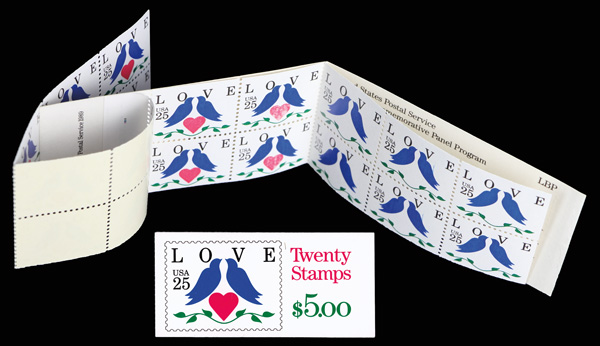5135 BKnh 2441c var. image1990, 25¢ Love, booklet pane of 10, bright pink omitted (Scott 2441c var.), right six stamps on transitional second pane of complete unexploded booklet (first pane normal), o.g., never hinged, Post Office fresh, the bright pink fading on positions 2 and 7, Very Fine, only 20 panes reported.