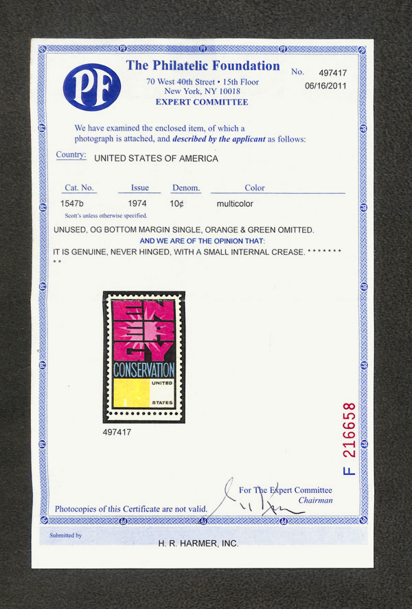 5129 nh 1547b image1974, 10¢ Energy Conservation, orange & green omitted (Scott 1547b), o.g., never hinged, Very Fine, only 150-250 reported, with 2011 P.F. certificate.