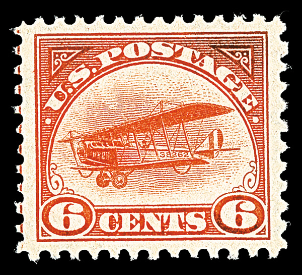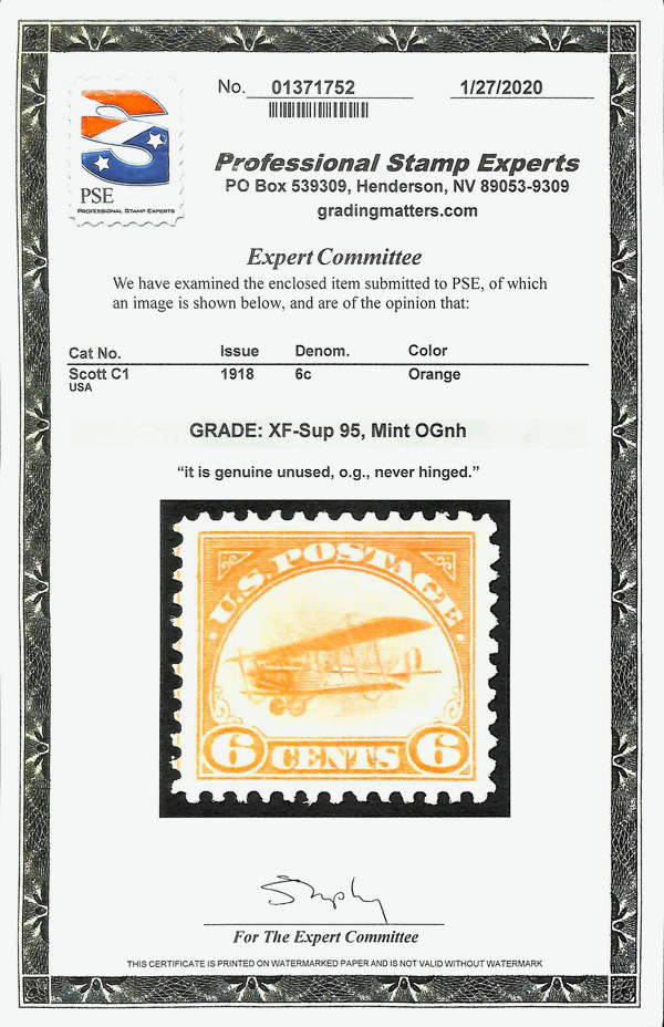 5152 nh C1 imageAirmail, 1918, 6¢ orange (Scott C1), exceptional framing, rich vibrant color, o.g., never hinged, Extremely Fine to Superb, with 2020 P.S.E. certificate graded XF-SUP 95.